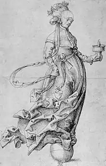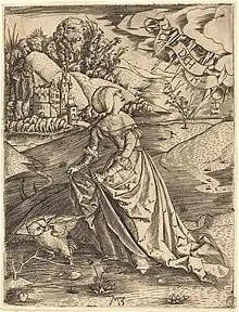 The unusual image of The Woman with the Owl, dated 1500, shows a woman lifting her skirts to protect an owl.[16] The motto in the sky behind her reads Duck dich or "Hide yourself", and the owl may represent sin or evil. Alternatively the scene may depict the content of a German folk song.[17]