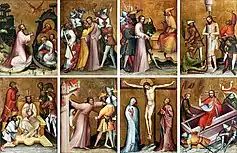 The Master of the Grudziądz Altarpiece was a Bohemian artist,[1] active at the end of the 14th and the beginning of the 15th century. His name is derived from an altarpiece which hung in the castle of the Teutonic Knights in Grudziądz (German: Graudenz), and may now be seen in National Museum in Warsaw.[2] Closed, the altarpiece depicts the Noli me tangere and the resurrection of the dead on two registers to the left; on the right, Christ in Majesty and the Virgin and John the Apostle. The wings show eight scenes from the Passion, while inside are scenes from the Life of the Virgin. At the center is an image of the Death and Coronation of the Virgin.