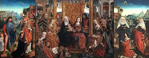 His notname is derived from a shuttered altarpiece at the Wallraf-Richartz-Museum in Cologne, created c.1503. The central part of the triptych is a holy kinship scene, with Saint Catherine and Saint Barbara, which also makes it a mystical marriage tableau.[1] It was commissioned, presumably for donation to a church, by Nikasius Hackeney, a tax administrator at the Imperial Court, and includes donor portraits of him and his family.