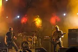 The "sludge/stoner/alternative metal outfit" Mastodon, as labeled by AllMusic, is "one of the preeminent metal acts of the early 21st century".[95] The BBC stated about Mastodon: "They might be bonkers of lyric, full of fantasy mumbo jumbo, but the band is unashamedly committed to its complex-of-composition craft, and the results have frequently stunned ever since their 2002 debut, Remission. They are the most ambitious, most fearless, most fun heavy metal band to have breached the mainstream since the genre oozed its way out of The Midlands in the 1970s."[109] Alternative Press has stated: "Mastodon are one of the all-time great hard rock groups."[110] Rolling Stone stated: "Mastodon are a bunch of doom-haunted, myth-obsessed, meat-and-potatoes Southern badasses who have become the most important new band in metal."[111] Playboy[112] wrote: "one of Mastodon’s greatest talents: the ability to take traditional metal fans along with them into other musical realms, and also appeal to more mainstream rock fans but give them some doses of metal."