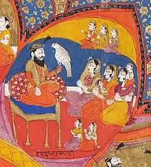 ![]() Depiction of Guru Gobind Singh with his three wives (including Mata Sahib Devan; seated left-most in the group of three) and children from a manuscript by Miha Singh of Kashmir dated to between 1839–1843. | |