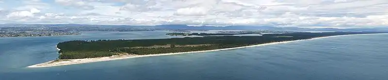 The island protects the entrance to the Tauranga harbour and stretches from Bowentown to Mount Maunganui.[11] Matakana Island is largely covered with pine trees although some land is cleared for the residents. Matakana Island has a relatively small population density of 4.2, though still more than the West Coast(1.3 as of the 2006 Census).[12] The island is the third largest by area associated with the North Island, or the fifteenth largest within New Zealand waters.