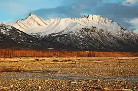 Matanuska Peak is a 6,093 ft (1,860 m) mountain summit located in the Chugach Mountains, in Matanuska-Susitna Borough in the U.S. state of Alaska. The mountain is a major landmark in the Matanuska Valley, situated 7.5 mi (12 km) east of Palmer, and 10 mi (16 km) north-northeast of Pioneer Peak. The nearest higher peak is Frontier Peak, 2.1 mi (3 km) to the southeast.[1] Matanuska Peak's name was officially approved in 1969 by the United States Geological Survey, and derives from the Matanuska River, a native name on maps since 1897.[2] "Matanuska" is derived from the Russian term for the "copper river people".[3][4] The Matanuska Peak Trail is a five mile one-way hike with 5,670 feet of elevation gain and minor scrambling. The months June through October offer the most favorable weather and snow-free trail conditions to climb this peak. The Matanuska Peak Challenge is a strenuous race run in August each year.