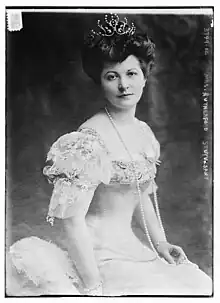After his death, she lived in Paris for several years,[20] and was active in American charities in France during World War I.[21] On 18 August 1933, she married for the third time to Belgian Prince Alexandre de Caraman-Chimay (1873–1951). Prince Alexandre was a son of Joseph de Caraman-Chimay, 18th Prince de Chimay and brother of Élisabeth, Countess Greffulhe and Joseph, Prince de Caraman-Chimay (married to American heiress Clara Ward).[22] He his first wife was Catherine Hélène, Princess Bassaraba de Brancovan (a daughter of Prince Grégoire),[23][24] who died in Paris in 1929, and was the mother of his only child, Prince Marc-Adolphe de Caraman-Chimay (1903–1992).[25]