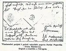 In 1562 Popović signed with ћ at the end of his signature, which is the same letter introduced by Vuk Karadžić at the beginning of the 19th century.[17] At the beginning of 1563 Popović was killed in Žumberak by another Orthodox priest.[18]