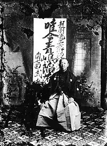 Okuda didn't participate further in the Kodokan-Totsuka rivalry, and in 1893 he moved his field of activity to the Iwate Prefecture by invitation of governor Ichizo Hattori.[4] As a consequence, he was not among the jujutsu masters gathered by Kano at the Dai Nippon Butoku Kai to inaugurate its jujutsu division in 1895 either. However, Okuda would join at some point, being granted the title of honorary judo master (柔道範士, judo hanshi).[1][2] In 1901, he opened a judo dojo in the city of Morioka, and he became an usual attender of tournaments and events while keeping his police teacher job.[1][4] His high knowledge and personal approach to throws were popularly nicknamed his "assassination technique" (殺気の技, sakki no waza), possibly in reference to his purported participation in the killings of the Shinsengumi.[1][3]