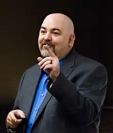 "I am absolutely convinced from my experience and the evidence that I've gathered over the years of doing this that [debates] are incredibly valuable."[29] He has spoken at atheist and freethought conferences around the country and debated numerous Christian apologists, including Ray Comfort (on The Atheist Experience),[29] and David Robertson on Premier Christian Radio's Unbelievable.[30][31] At the 2014 American Atheists convention in Salt Lake City, he gave a workshop that outlined some key ideas in effective debating: "Take the opponent seriously: 'The audience has to sense that I can perfectly understand their views, and have rejected them.' Use logic: 'I tell them that I can write a better book than the Bible. Simple: I copy it word for word, except the parts about slavery.' And don't forget emotion: 'It is theater. That is my advantage with a Baptist background over someone like Richard Dawkins, although he knows more about science.'"[32] He has also stated that he is willing to say "I don't know" in a debate, a "scary concept" to some of his audience.[33][29] Alongside fellow activists Seth Andrews and Aron Ra, he traveled to Australia in March 2015 as a member of the Unholy Trinity Tour.[34][35] In April 2015 he was an invited speaker at the Merseyside Skeptics Society QEDCon in Manchester, United Kingdom.[36][37] In 2018, Dillahunty participated in a discussion with Canadian psychology professor Jordan Peterson for Pangburn Philosophy in which they encountered areas of disagreement about religion, specifically its relationship with values and culture.[38] The debate was uploaded to Pangburn Philosophy's YouTube channel.[38]