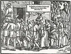 ![]() Peasants bound by ropes and being taken to London for trial. The inscription says "You will be led before Princes and Rulers for my names sake. Matthew 10". John Foxe's Book of Martyrs (1563). | |
