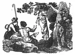 A hanged wolf in sheep's clothing. A 19th century illustration of the mediaeval fable attributed to Aesop
