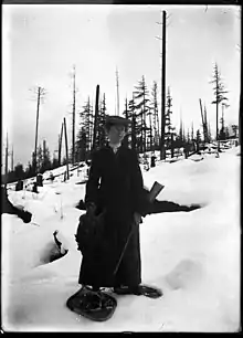 Gunterman mainly took photographs from 1897 to 1911. Her photographs were mainly taken in areas surrounding Beaton and the Arrow Lakes District of British Columbia as well as in the Pacific Northwest and California during her travels there in 1905.[6] Typically during the winter months Gunterman would develop her glass plate negatives and turn them into prints.[7] Initially, her primary purpose for taking photographs was to record her life, family and surroundings for her son Henry.[3] She created her own autobiographical narrative through her photographs. In order to create self-portraits and to include herself in group photos, Gunterman would use a piece of rubber tubing attached to the camera's inflatable shutter at one end and a rubber bulb at the other to take the picture.[2] The first camera that she used was a Bull's Eye snapshot camera.[7] Her works at the start mainly consisted of posed group photos. She then purchased a No.5 Cartridge Kodak 4 x 5 plate camera in 1898 as it allowed for more versatility when playing with exposure, focusing and shutter speed.[6] In 1902 Gunterman became the chef at the Nettie-L mine in the Lardeau region and at each long work shift she brought along her camera.[2] She captured everyday life at the mine such as scenic views of the Lardeau region, men working hard in the mine and her fellow kitchen co-workers.[3] Her photographs expose the gruelling work at the mine but also focus on more lighthearted aspects such as games they would play.[3] Mining operations such as the Nettie-L and other surrounding mines totally ceased by 1905. However within the Kootenays logging activity increased and became another subject for Gunterman to photograph. Her work is essential for understanding life during the mining boom in the early 1900s. Furthermore, her photographs of both mining and logging activity are fundamental for understanding the jobs that drove the Canadian economy during the turn of the century. Gunterman's work is also some of the only photographic evidence of these mining towns when they were flourishing.[3]