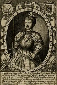 John Talbot, 1st Earl of Shrewsbury, 1st Earl of Waterford, 7th Baron Talbot, KG (c. 1387 – 17 July 1453), known as "Old Talbot", was an English nobleman and a noted military commander during the Hundred Years' War. He was the most renowned in England and most feared in France of the English captains in the last stages of the conflict. Known as a tough, cruel, and quarrelsome man,[1] Talbot distinguished himself militarily in a time of decline for the English. Called the "English Achilles" and the "Terror of the French", he is lavishly praised in the plays of Shakespeare. The manner of his death, leading an ill-advised charge against field artillery, has come to symbolize the passing of the age of chivalry.[2] He also held the subsidiary titles of 10th Baron Strange of Blackmere and 6th Baron Furnivall jure uxoris.