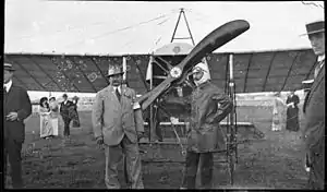 The party arrived in Sydney early in April, and spent the first fortnight assembling the Bleriot. His first flying display was given at Victoria Park, Zetland, Sydney, on 19 April 1914,[6] followed by a display at Newcastle on 25 April.[7] He was immediately received in the highest circles of Australian society, being officially welcomed to Sydney by the Lord Mayor on 28 April.[8] During May and June he also performed in Melbourne, in regional centres such as Wagga Wagga, Albury, Bendigo, Ballarat, Geelong, and Bathurst and in Adelaide. These displays were hugely successful: hundreds of thousands of people paid to see him fly.[9] He was received at Government House, Melbourne, and actually landed and took off from its grounds.[10]