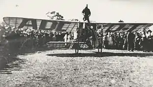 Lebbeus Hordern enlisted the services of Guillaux and his team to assemble and test fly the aircraft, and on May 8, 1914, Maurice Guillaux flew the Farman for the first time.[11] Over the next few days he made many flights carrying passengers including the owner of the aircraft and Miss Louise Carbasse, then a 19-year-old Australian actress. After the war, she became a well-known Hollywood actress under the name of Louise Lovely.[12]