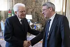 In 2016, he was particularly involved in the 2016 constitutional referendum proposed by Renzi,[23] where voters were asked whether they approve a constitutional law that amended the Italian Constitution to reform the composition and powers of the Parliament of Italy, as well as the division of powers between the State, the regions, and administrative entities.[24] Landini campaigned for the "No", stating that it was a "badly made reform".[25] On 4 December, the reform was reject by voters with 59% of votes against and 41% in favor, and Renzi resigned from his post.[26]