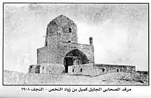 Kumayl ibn Ziyad was buried at the site after his killing at the hands of Al-Hajjaj ibn Yusuf, and a shrine was built over his grave. The shrine was first built in 1950 by Sheikh Ali al-Baghdadi, the custodian of the Najaf shrine who ordered its construction.[3] The place was subsequently expanded in the 1970s. The dome over the shrine was replaced in 2000 after a merchant, Hajj Abdul-Husayn al-Saraf, funded a restoration of the shrine.[4] Then in 2007, the government of Najaf donated a sum of money to expand and repair the shrine. The courtyard of the shrine was reconstructed in 2009 and the drainage systems were repaired as well.[5]