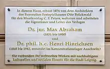 In 1873, Abraham acquired an undeveloped property on Leipziger Talstrasse and had the architect Otto Brückwald build a residential and commercial building on it. In 1874, this became the headquarters of the music publisher CF Peters. In this house there is now an Edvard Grieg memorial. In 1893, Max Abraham donated the Peters Music Library in Leipzig, which opened on January 2, 1894. It is considered the first of its kind in Germany and was an inspiration for Wilhelm Altmann to create an even more comprehensive collection