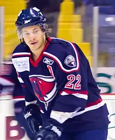 In the 2012–13 season, he helped the Odense Bulldogs reach the semifinals of Superisligaen in Denmark.[3] He spent the 2013–14 season in England, playing for the Sheffield Steelers of the EIHL. He led the Steelers in scoring (31 games: 18 goals, 18 assists) before twin fractures in his ankle cut his season short.[4]