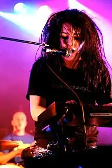 On stage MayKay dresses in either black or white and is known for her "long black hair and banshee wail".[4] She often plays the keyboard with her head during live performances.[4] She has also played the drill.[8] She and most of the band members, with the exception of the drummer, are known for their consumption of alcohol.[4] She likes bands such as Adebisi Shank, Giveamanakick, Grand Pocket Orchestra and Jape.[1] MayKay has also collaborated with Elaine Mai on 'No Forever' (2021).