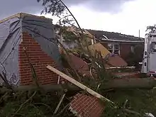 The initial squall line formed in central Kansas, to the northwest of Hutchinson.[14] In Hutchinson, several airplanes were flipped at a local airport, and 21,000 people were left without power. A woman was killed in New Albany, Kansas, when her mobile home was blown forty feet off of its foundation.[7] National Weather Service survey teams found that winds reached 120 mph (190 km/h) in the area, which also resulted in the destruction of a church and the town's post office, in addition to damaging several homes.[7][14] A total of 130 buildings were damaged in Cherokee, Kansas, including a high school gymnasium. Schools in several counties closed for the day, and a twenty-mile stretch of the Kansas Turnpike was closed for an hour due to flooding.[7]