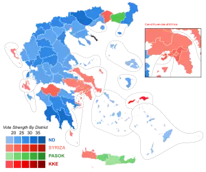 New Democracy won most districts of the Greek countryside, winning in its traditional strongholds of Macedonia and Peloponnese. However, 19% of the vote for New Democracy is an all-time low for the party, down from its previous all-time low of 33% which occurred in the previous election in 2009. SYRIZA won the highest number of votes in most urban areas, including Athens and Thessaloniki. This is the first time since the election of 1977 that a party besides New Democracy or PASOK finished as one of the top two parties. PASOK, who have spent 21 years in government on-and-off since 1981, suffered their worst defeat since 1974, reduced to just 13% of the vote. PASOK finished in first place in four prefectures: Heraklion, Lasithi, Rethymno, and Rhodope. It has been suggested that Syriza's sudden success depended on PASOK joining the right-wing pro-austerity coalition and Syriza convincing voters that it was "the only 'true' leftist party" which unlike their rivals would actively renegotiate the austerity terms.[66]