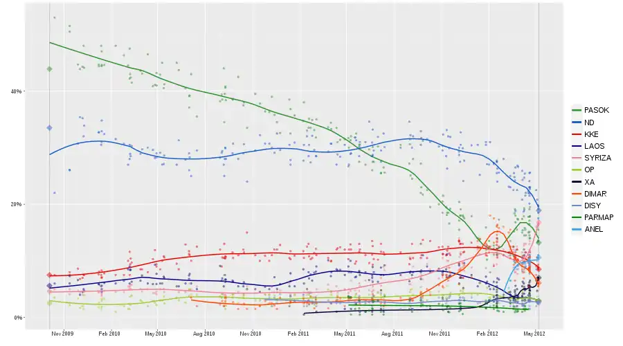 Legislative elections were held in Greece on Sunday, 6 May 2012 to elect all 300 members to the Hellenic Parliament. It was scheduled to be held in late 2013, four years after the previous election; however, an early election was stipulated in the coalition agreement of November 2011 which formed the Papademos Cabinet. The coalition comprised both of Greece's traditional major political parties, PASOK on the left and New Democracy (ND) on the right, as well as the right-wing Popular Orthodox Rally (LAOS). The aim of the coalition was to relieve the Greek government-debt crisis by ratifying and implementing decisions taken with other Eurozone countries and the International Monetary Fund (IMF) a month earlier.[1]