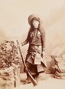 Gordon Lillie's wedding gift to his bride was a pony and a Marlin .22 target rifle. In 1887 May debuted at a sharpshooter for Pawnee Bill's Great Wild West Show and was billed as 'the greatest Lady Horseback Rifle-shot of the World'. May traveled the country with her husband's show and was one of the first women to perform as an equestrian and shooter in American Wild West shows. May suffered a shooting injury during an act in 1899 that required two of her fingers to be amputated.[2] While on tour in 1907, May gave a speech to women in Chicago, she said: "Let any normally healthy woman who is ordinarily strong screw up her courage and tackle a bucking bronco, and she will find the most fascinating pastime in the field of feminine athletic endeavor. There is nothing to compare, to increase the joy of living, and once accomplished, she’ll have more real fun than any pink tea or theater party or ballroom ever yielded."[1]