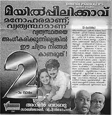 Mayilpeelikkavu (transl. Peacock-feather shrine) is a 1998 Indian Malayalam-language mystery thriller film directed by the Anil-Babu duo and starring Kunchacko Boban and Jomol. This film is about reincarnation and revenge.[1][2] The movie has many similarities with the 1991 American movie Dead Again. It was one of the first Indian movies to have an internet website.