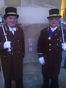 The position of Mayor in Monmouth was established in the thirteenth century by the people who were controlling the town's market. A seal was obtained from King Henry III confirming the rights and privileges of the position and the right to also establish bailiffs for the town. The position was confirmed in 1447 when Henry VI granted a charter to the town which permitted the town to raise taxes to pay for the town and also gave some freedom from the King's taxes. (Henry VI's father had been born in the town.) This charter confirmed the position of mayor as an annual elected position and agreed that two maces should be carried before the elected person. These maces survive and carry the arms of the Duchy of Lancaster.[1]