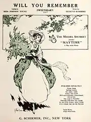Maytime is a musical with music by Sigmund Romberg and lyrics and book by Rida Johnson Young, and with additional lyrics by Cyrus Wood. The story is based on the 1913 German operetta Wie einst im Mai (Like Once in May), composed by Walter Kollo, with words by Rudolf Bernauer and Rudolph Schanzer. The story, set in New York, is told in episodes covering a long period, from 1840 to the 20th century. Wealthy young Ottillie is in love with Dick, but they are kept apart by family and circumstance. Years later, their descendants marry. Maytime introduced songs such as "The Road to Paradise", "Will You Remember?" and "Jump Jim Crow".