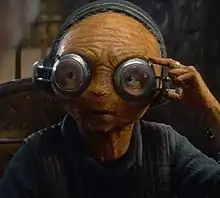 Maz is a diminutive, humanoid alien with orange-tinted skin who wears large goggles.[2] A former pirate and smuggler, she runs an interstellar tavern in a castle on the planet Takodana.[12] Abrams said of her backstory: