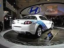 The Mazda RX-8 Hydrogen RE is a 2003 bi-fuel version of the RX-8 sports car, in which the twin-rotor wankel rotary engine is configured to run on either hydrogen or gasoline. This is the fifth Mazda vehicle to be fitted with a hydrogen wankel rotary engine.