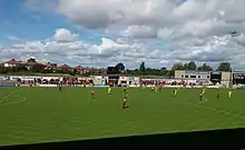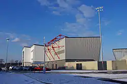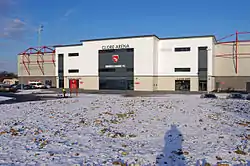 The Mazuma Mobile Stadium (formerly known as the Globe Arena for sponsorship reasons) is a football stadium in Morecambe, Lancashire, England, which is the home of Morecambe F.C.[1][2][3][4][5] The stadium opened in 2010, replacing the old Morecambe F.C. stadium, Christie Park, which was Morecambe's home from 1921 to 2010.[6] The stadium holds up to 6,476 supporters, with 2,173 seats available in the Main Stand, which runs the length of one side of the pitch.[7] Opposite the Main Stand is an uncovered terrace with a capacity of 606, giving a similar feel to the ground as that at Christie Park. At either ends of the pitch are the home and away stands, with the home end holding a maximum of 2,234 supporters and the away end having a capacity of 1,389.[8] In the north east corner of the stadium is the Tyson Fury Foundation, which is split between two floors. The building also houses a gym, which was purchased by Tyson Fury in August 2020.[9]