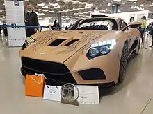 The Evantra 771 was unveiled at the 2016 Bologna Motor Show, as an evolution of the Evantra.[14] The LS7 used in the base Evantra has been modified to produce an extra 20 hp and the newly revised engine now produces 771 PS (760 hp; 567 kW) at 7,700 RPM and 642 lb⋅ft (870 N⋅m) at 6,890 RPM hence the nomenclature.[15] It has a claimed top speed of 336 km/h (209 mph), and a 0–97 km/h (0–60 mph) acceleration time of around 3 seconds.[16][15] Power is sent to the rear wheels via a 7-speed sequential transmission. The light weight OZ racing wheels measure 12 in (30 cm) by 20 in (51 cm) at the rear, 9.5 in (24 cm) by 20 in (51 cm) at the front and are shod with 325/25R20 & 255/30R20 Pirelli P Zeroes tyres respectively.[15] Stopping power is provided by 380 mm (15 in) rotors with 6-piston calipers at the front and 360 mm (14.2 in) rotors with 4-piston calipers at the rear, with carbon-ceramic brakes being optional.[15] MacPherson struts at all four corners are responsible for ride stability.[17] Sales began in the spring of 2017, and like all other Mazzanti models was limited to a production run of 5 per year.[15]