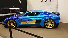 The Evantra Pura was unveiled at the 2021 Florence Biennale art festival in Florence.[23] It shares its engine with the 781, that being a supercharged 6.2L LT2 that produces 761 PS (751 hp; 560 kW) at 6,300 RPM and 910 N⋅m (671 lb⋅ft) at 4,300 RPM.[24] The manufacturer claims that the Pura can accelerate from 0–100 km/h (0–62 mph) in 2.9 seconds, with a top speed of over 360 km/h (224 mph).[25] The Pura is considered the entry model within the Evantra series and has more emphasis on lightness and sheer driving pleasure, in fact the car weighs only 1,290 kg (2,844 lb), with the chassis being made of high-tensile steel, and molybdenum chrome which allows for flexibility in the corners.[23][26] The car has MacPherson struts at each corner of the vehicle with fully adjustable suspension as an option.[26] Stopping power is provided by provided by carbon-ceramic Brembos, with 6-piston calipers and 14.9 in (378 mm) rotors at the front, and 4-piston calipers and 14 in (356 mm) rotors at the rear.[23] The car is fitted with OZ Racing wheels, with the fronts measuring 9.5 in (24 cm) by 19 in (48 cm) at the front and 12 in (30 cm) by 20 in (51 cm) at the rear, shod with 255/35R19 and 315/30R20 Michelin rubber respectively.[24][26] Power is sent to the rear wheels via a 7-speed sequential paddle-shift gearbox.[23]