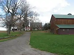 The barn is a two-story frame structure built to shelter both plant products and livestock. On the ground floor, stalls are in place to hold more than thirty cattle, while the second floor consists primarily of a hayloft.[1]: 6 Built circa 1850, the barn is the most southerly building on the farm;[1]: 12 its location arises from the presence of a small spring, which its builder intended for it to cover. Oak timbers are used to construct a post and lintel frame; the remarkably well-preserved original construction is its most historically significant aspect. Outside, the walls are covered by the original timbered siding, and the roof is covered with shingles of asbestos. Two related and significant modifications have been made to the barn: part of the western end was removed after was badly damaged in a storm, and a concrete block milkhouse was built in its place in the 1960s.[1]: 6