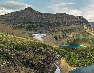 Like other mountains in Glacier National Park, the mountain is composed of sedimentary rock laid down during the Precambrian to Jurassic periods. Formed in shallow seas, this sedimentary rock was initially uplifted beginning 170 million years ago when the Lewis Overthrust fault pushed an enormous slab of precambrian rocks 3 mi (4.8 km) thick, 50 miles (80 km) wide and 160 miles (260 km) long over younger rock of the cretaceous period.[4]