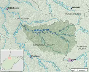 McElroy Creek is a tributary of Middle Island Creek, 22.1 miles (35.6 km) long,[5] in northern West Virginia in the United States. Via Middle Island Creek and the Ohio River, it is part of the watershed of the Mississippi River, draining an area of 106.2 square miles (275 km2)[6] in a rural region on the unglaciated portion of the Allegheny Plateau.