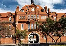 The plans were prepared by the Royal Engineers' Department, under the direction of architect Major Robert Barklie RE, Larne, County Antrim.[8] An imposing an extravagant cavalry barracks, the style of the officers' Mess is a mixture between Elizabethan and Queen Anne, and the general appearance of its red brick and red roof tiles, with "traceried windows, floriated pinnacles, parapets and panelled battlements", (quoting Lt. Col. MacNeill description in his Cosantoir account of the building of the barracks), may be described as being in a broad "romantic" style but not in any specific national style or idiom (O'Donnell suggests that elements like the pepper-box turrets and cupolas may even be seen in Russian and Turkish design of the time). The men's billets are in robust Tudor style.[2]