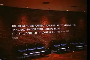 The building had two main entrances: a main entrance at ground level that faced east onto Queen's Park Drive, and a connecting passageway from the Royal Ontario Museum from what used to be the Mineralogy Gallery. On the wall opposite from the ticket booth and coat check was an evocative quote from Dante Alighieri Divine Comedy. Admission to either facility allowed visitors to see exhibits in both buildings, though a planetarium show cost extra.