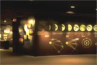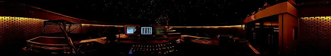 The projector could be controlled by a console where an individual presenter would provide specific talks or lectures. By the mid-1970s, automation features were added, which led to the creation of prerecorded shows.[13] Most visitors to the facility would have seen an automated 40- to 45-minute audio/visual show on a particular space-related topic. Two types of shows were typically alternated on a daily basis: one aimed at families with young children and another aimed at older children and adults.[14] Typical shows aimed at both audience types were built around themes such as space travel, the mythical stories behind the constellations, and around Christmas-time, a show that investigated theories on stellar explanations for the Star of Bethlehem. A listing from 1970 includes shows titled The Story of Eclipses, which looked at how solar eclipses occur and their scientific importance, Man and the Zodiac which explored the history of mythology and astrology with regard to the night sky, and The Planet Venus which surveyed the history of the planet in mythology, the planet's motion across the sky and featured imagined views from its surface.[15]