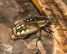 Mecynorhina polyphemus is a large scarab beetle of the subfamily Cetoniinae found in dense tropical African forests, sometimes called the Polyphemus beetle. It is a frequent feeder on fruits and sap flows from tree wounds.