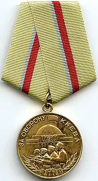 The Medal "For the Defence of Kiev" (Russian: Медаль «За оборону Киева») was a World War II campaign medal of the Soviet Union established on June 21, 1961 by decree of the Presidium of the Supreme Soviet of the USSR[1] to be awarded to the participants of the defence of the city of Kyiv during the 1941 invasion of the USSR by Nazi Germany.