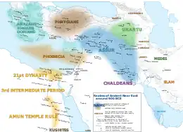 Its borders were limited in the north by the non-Iranian states of Gizilbunda and Mannea, and to its south by Ellipi and Elam.[17][19] Gizilbunda was located in the Qaflankuh Mountains, and Ellipi was located in the south of modern Lorestan Province.[19] On the east and southeast of Media, as described by the Assyrians, another land with the name of "Patušarra" appears. This land was located near a mountain range which the Assyrians call "Bikni" and describe as "Lapis Lazuli Mountain". There are differing opinions on the location of this mountain. Mount Damavand of Tehran and Alvand of Hamadan are two proposed sites. This location is the most remote eastern area that the Assyrians knew of or reached during their expansion until the beginning of the 7th century BC.[20]