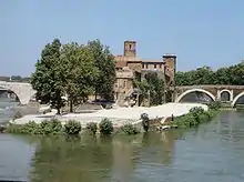 A signal event in the Roman medical community was the construction of the first Aesculapium (a temple to the god of healing) in the city of Rome, on Tiber Island.[3] In 293 BC, some officials consulted the Sibylline Books concerning measures to be taken against the plague and were advised to bring Aesculapius from Epidaurus to Rome. The sacred serpent from Epidaurus was conferred ritually on the new temple, or, in some accounts, the serpent escaped from the ship and swam to the island. Baths have been found there as well as votive offerings (donaria) in the shape of specific organs. In classical times the center covered the entire island and included a long-term recovery center. The emperor Claudius[4] had a law passed granting freedom to slaves who had been sent to the institution for cure but were abandoned there. This law probably facilitated state disposition of the patients and recovery of the beds they occupied. The details are not available.