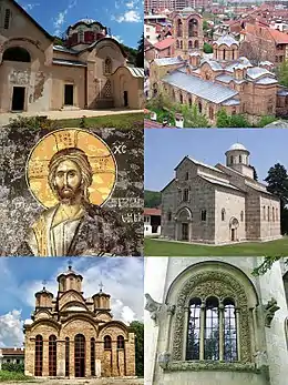 ![]() Clockwise from top left: Church of Patriarchal Monastery of Peć, Our Lady of Ljeviš, Church of Visoki Dečani, a window at Visoki Dečani, Church of Gračanica, fresco of Christ at Our Lady of Ljeviš | |