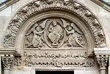 Most churches were extensively frescoed; a typical scheme had Christ in Majesty at the east (altar) end, a Last Judgement at the west end over the doors, and scenes from the Life of Christ facing typologically matching Old Testament scenes on the nave walls. The "greatest surviving monument of Romanesque wall painting", much reduced from what was originally there, is in the Abbey Church of Saint-Savin-sur-Gartempe near Poitiers, where the rounded barrel vault of the nave, the crypt, portico and other areas retain most of their paintings.[34] An equivalent cycle in Sant'Angelo in Formis at Capua in southern Italy by Italian painters trained by Greeks illustrates the continuing predominance of Byzantine style in much of Italy.[35]