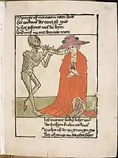 The end of the period includes new media such as prints; along with small panel paintings these were frequently used for the emotive andachtsbilder ("devotional images") influenced by new religious trends of the period. These were images of moments detached from the narrative of the Passion of Christ designed for meditation on his sufferings, or those of the Virgin: the Man of Sorrows, Pietà, Veil of Veronica or Arma Christi. The trauma of the Black Death in the mid-14th century was at least partly responsible for the popularity of themes such as the Dance of Death and Memento mori. In the cheap blockbooks with text (often in the vernacular) and images cut in a single woodcut, works such as that illustrated (left), the Ars Moriendi (Art of Dying) and typological verse summaries of the bible like the Speculum Humanae Salvationis (Mirror of Human Salvation) were the most popular.