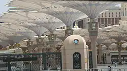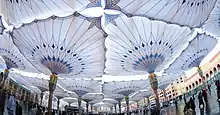 Medina Haram Piazza Shading Umbrellas or Al-Masjid An-Nabawi Umbrellas are convertible umbrellas erected at the piazza of Al-Masjid an-Nabawi in Medina, Saudi Arabia.[1] The shade of the umbrella is spread in the four corners, and the area covered by the shade extends to 143,000 square meters. These umbrellas are aimed to protect worshipers from the heat of the sun during prayer, as well as from the risk of slipping and falling in the event of rain. Similar structures are built at the square of the mosques worldwide. At Al-Masjid An-Nabawi, there are a total of 250 umbrellas.[2]