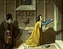 In 1387 the grand duke Jogaila abandoned paganism and adopted the Roman Catholic faith, which is usually considered as the christening of Lithuania. In an accompanying act he set up and endowed 7 churches, among them the one in Medininkai.[6] According to historians it demonstrates that there was already some sort of settlement beyond the castle walls existent at the time. It proves also that Medininkai was among key points in the state infrastructure.[7] The church has indeed been constructed. In 1391 Jogaila subordinated the shrine to the newly erected Bystritsa parish, where he set up the monastery of Canons of Penitence; it is most likely they who delivered religious service in the Medininkai church.[8] The year of 1398 brings the first information about a representative of the grand duke and his powers in Medininkai; he is mentioned as a certain "Careybo" (Korejwo, Korejko).[9] His rule was rather shaky, though; in 1402 another raid of Teutonic Order knights, this time commanded by Wilhelm von Helfenstein, seized and burnt the stronghold.[10]