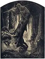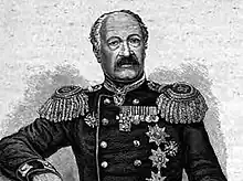 At the time the owner of the Medininkai estate was first the son of Ignacy Grabowski, Józef[78] and then his relative Apolinary Grabowski,[79] major of the imperial Russian army and deputy chairman of the Vilnius county nobility.[80] Under his rule the economy got heavily indebted; in the 1850s a certain Zofia Kamińska purchased Grabowski's payable notes and became the next owner.[81] In 1857 she was permitted to build a small chapel, completed the same year near foundations of the disassembled church. Kamińska ensured also the religious service, though formal status of a priest saying the mass is not clarified.[82] After 3 years and in unknown circumstances the priest was moved to the Carmelitan monastery in Vilnius; also in 1860 the chapel was demolished.[82] At that time the town was visited by a Polish writer Władysław Syrokomla; his late-romantic account dedicated to ruins of the castle was published as part of a book, which went to print in 1860.[83] During the January Rising in the spring of 1863 Medininkai proved a recruitment ground for an insurgent detachment of Józef Śniadecki.[84]